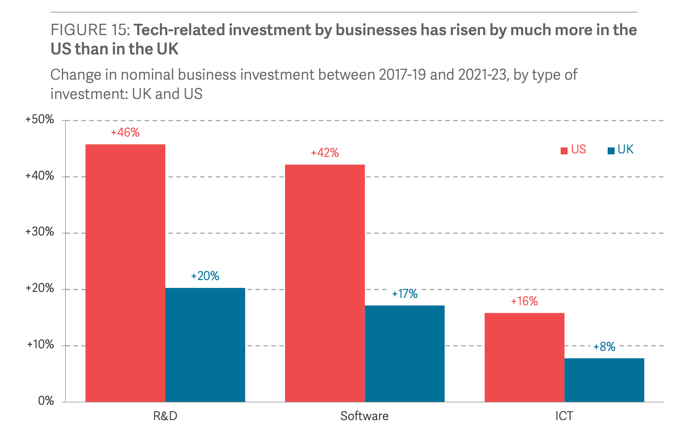 You can see all that in the two charts below. Already, the core drivers of American outperformance compared to Britain (and, indeed, most of Europe and the Anglosphere) are in the high-end services that Britain thinks it excels in. Already, investment growth in tech and software has been twice as high in America. And, much as I grudgingly respect the Salesforces, Zooms and Workdays of the world, these figures come from a pre-ChatGPT period when the technology on offer was much less impressive than what we have now, and the returns from taking it seriously correspondingly much lower.