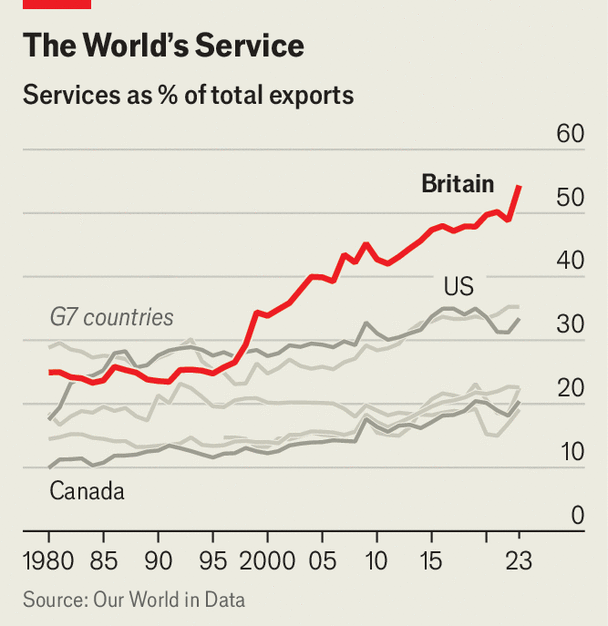 If there is one defining fact about the British economy, it is that services dominate. That, one could fairly reply, is true of every advanced economy, no matter the hopes of the manufacturing nostalgics. But the skew to services in Britain is remarkable, even compared with its peers. No other G7 country has services made up much more than a third of total exports. In Britain, that figure is over half.