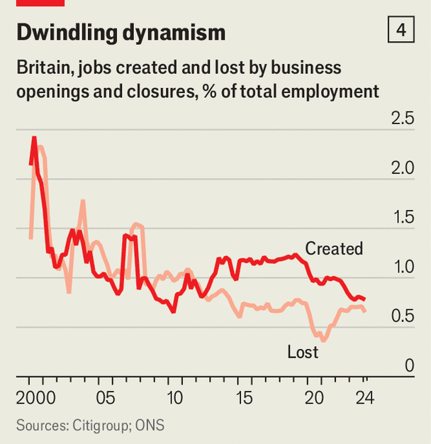 Tack that on to a longer trend, too, of declining dynamism across the British economy, which has been played out for decades. The next two charts measure that fall in two different ways. The first, which I published in June 2024 (for a cover arguing, in hindsight not unfairly, that Labour’s growth agenda was all-leaf-and-no-carrot), shows that fewer businesses are being born and, probably more important, fewer are dying.