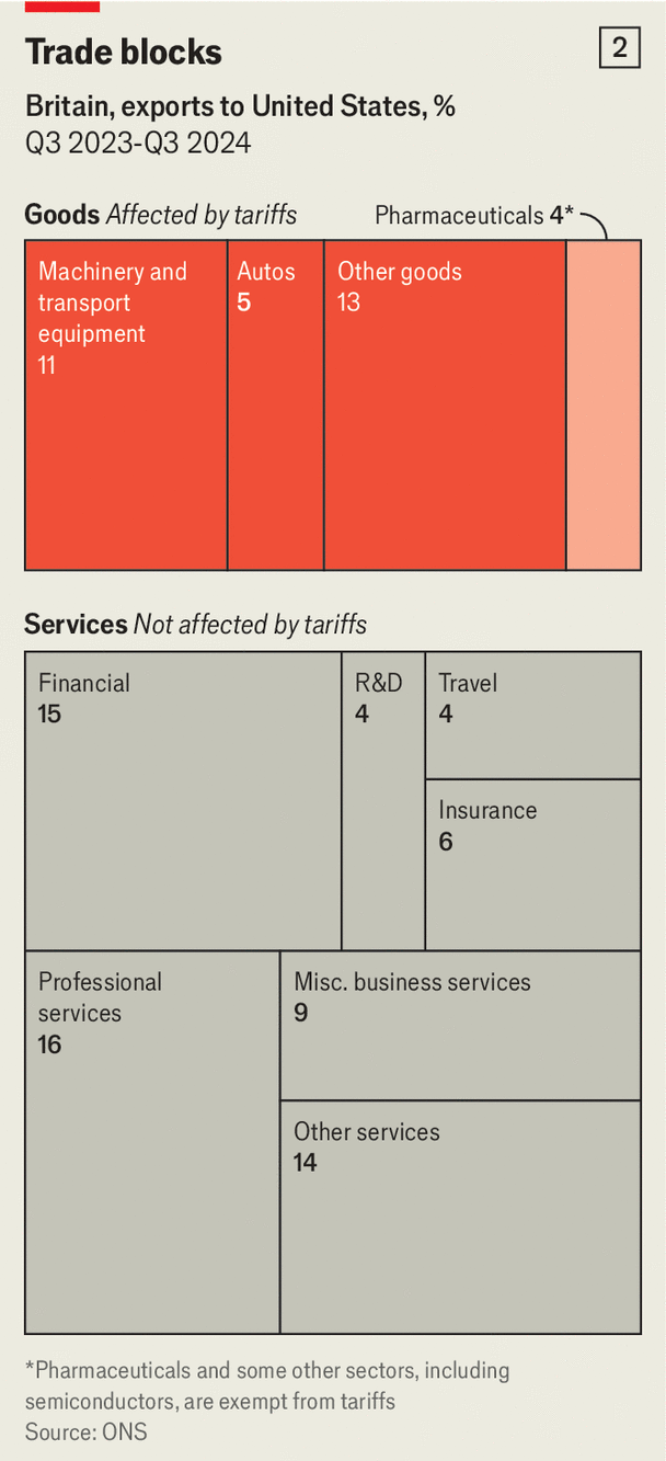 When tariffs started raining down, that tilt offered an under-appreciated advantage: Donald Trump doesn’t seem to believe in services and has largely exempted them from his trade war. Both of the charts above come from a piece of mine from last April, explaining why Britain was well-insulated from tariffs as a result3.