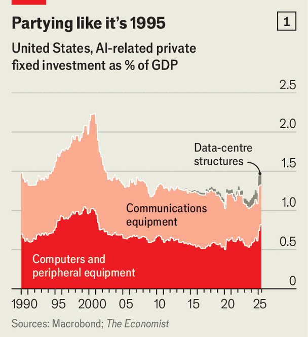 The broader macroeconomic ripples would be unpleasant, too. Playing out the full scenario gets rather fiddly, but an AI-led cycle that raises global yields could well also impose inappropriately high long-term interest rates on laggard economies, constricting access to credit. There is a halfway-parallel to the 1990s-era anxieties about America damaging emerging markets by exporting its monetary cycle: less about importing capital flows and currency crashes—more getting stuck with other countries’ interest rate environment while lacking their growth.