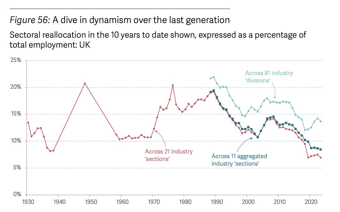 And the second, cribbed again from the Resolution Foundation, shows something similar over a longer timeframe: people are ever less likely to switch industry. A churning, fast-growing, competitive, dynamic economy should not have seen sector-hopping drop by half in twenty years.
