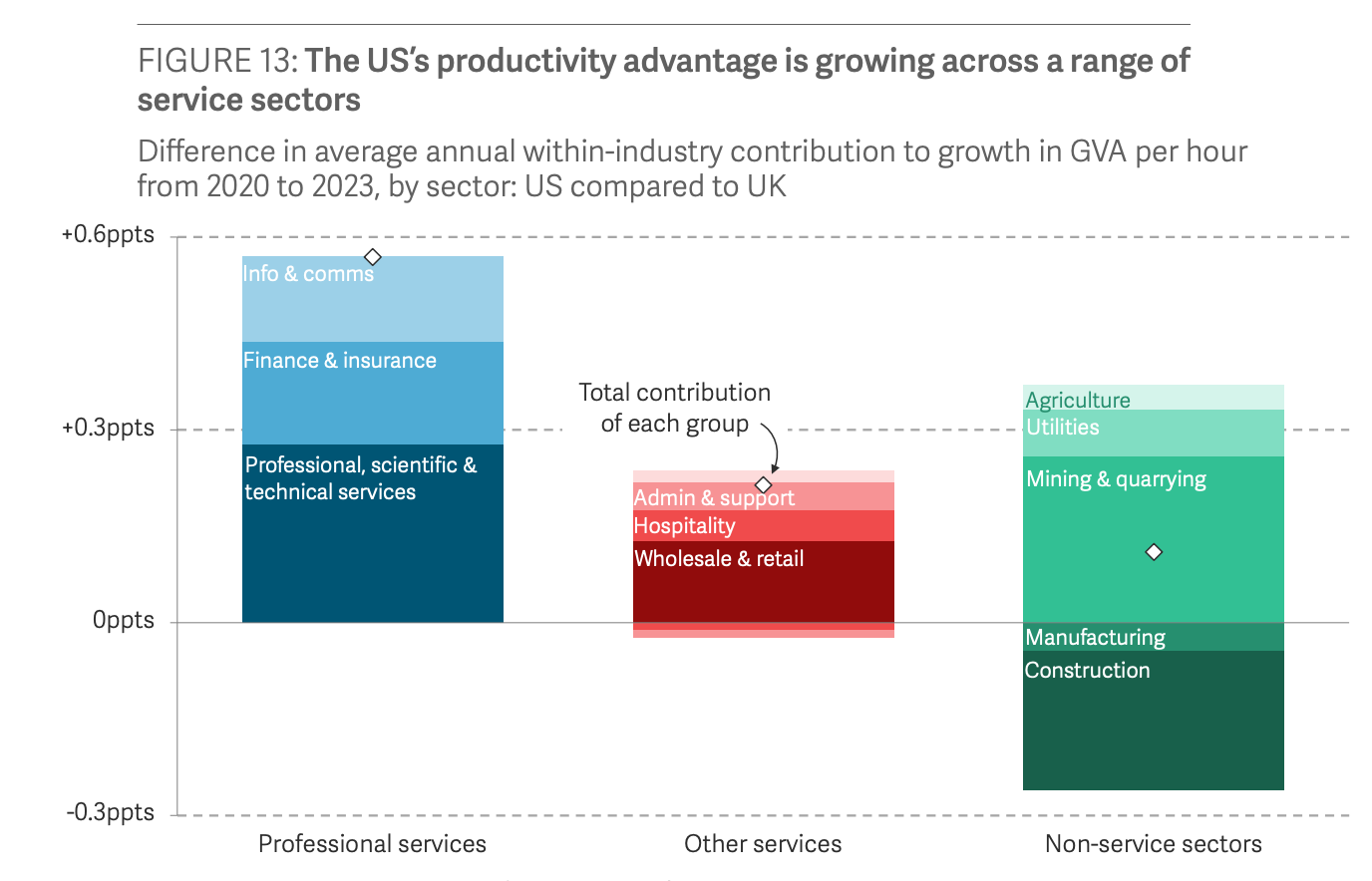 I’d argue the opposite claim is more compelling: that Britain’s economy is becoming less dynamic, exactly when dynamism is becoming more critical. The faster the world is changing, the greater the gains for the agile—and the perils for the sluggish. Take a look at the past few years. There are plenty of explanations jostling about for America’s recent outperformance. Certainly, Europe’s natural gas shock in 2022-3 didn’t help things. But if I had to pick one factor5, I’d probably go with B2B SaaS6. That is, the effective deployment of technology in unsexy sectors across the economy, what the Resolution Foundation calls (in a great and under-discussed report from last year comparing growth in Britain and America) “tech-using, rather than tech-producing services”.