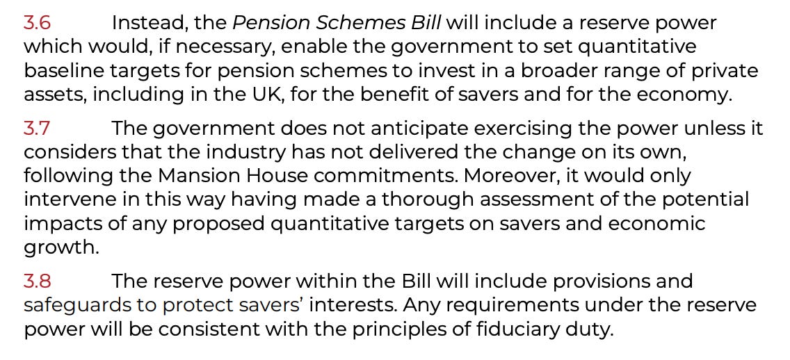 But: that is only because of promises (the Mansion House commitments) that some of the largest pension schemes have made, and the government is creating a “reserve power” to force mandation later on. (Less good!)
