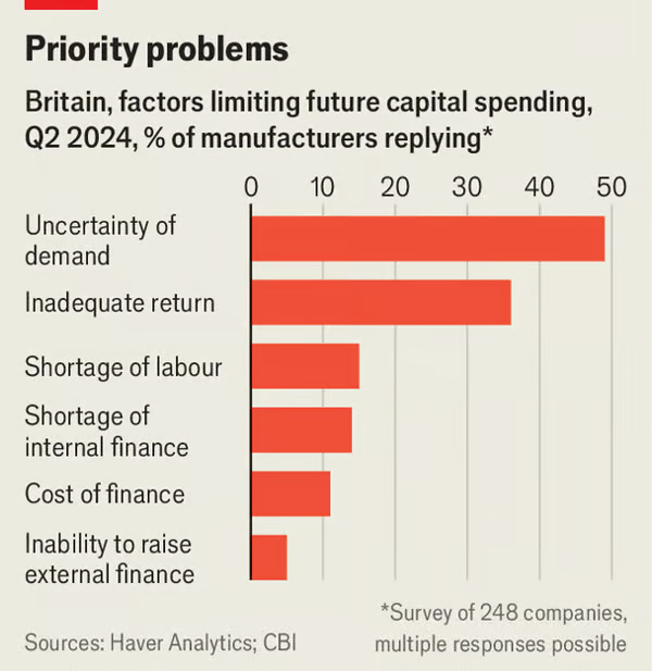 One way to sense-check that view is to ask companies. Thankfully, Britain has long-running surveys that do exactly that. I took a look at one, the CBI’s Industrial Trends Survey, last year when writing about the National Wealth Fund (another initiative premised on financing being a big bottleneck to British growth). The CBI asks a panel of manufacturers why they aren’t investing more in capital, like new machines and buildings.
