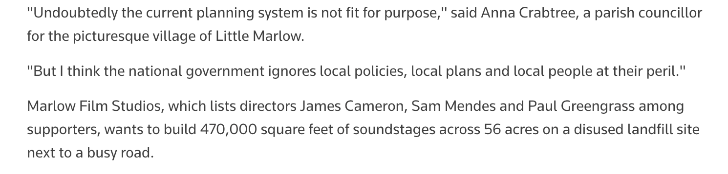 Perhaps, for instance, investors would be keener to put money into Britain if it didn’t take over four years and the personal intervention of the Deputy Prime Minister to get (still-outstanding) approval to build some film studios on the site of a former landfill in Buckinghamshire.