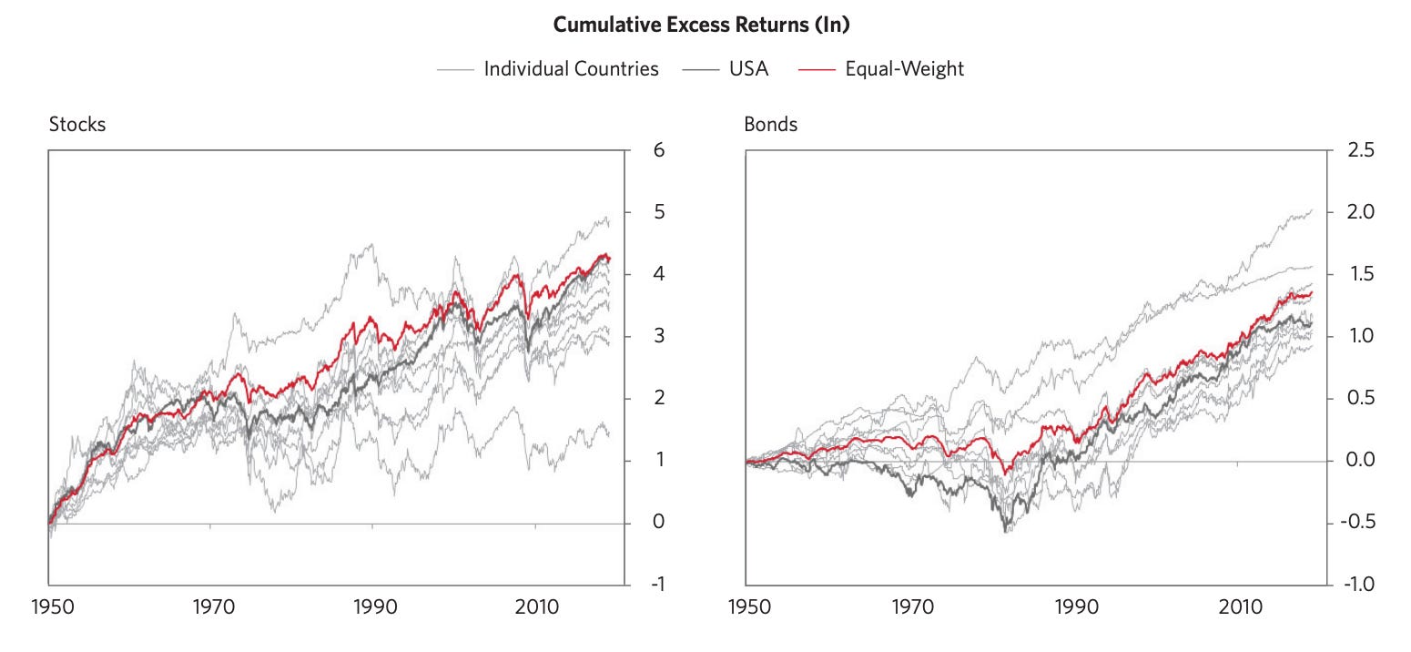 The chart below, from my former employer, illustrates the stakes. A globally diversified return stream (the red line) has for decades been a higher-returning strategy with less volatility than choosing one specific country (the grey lines).